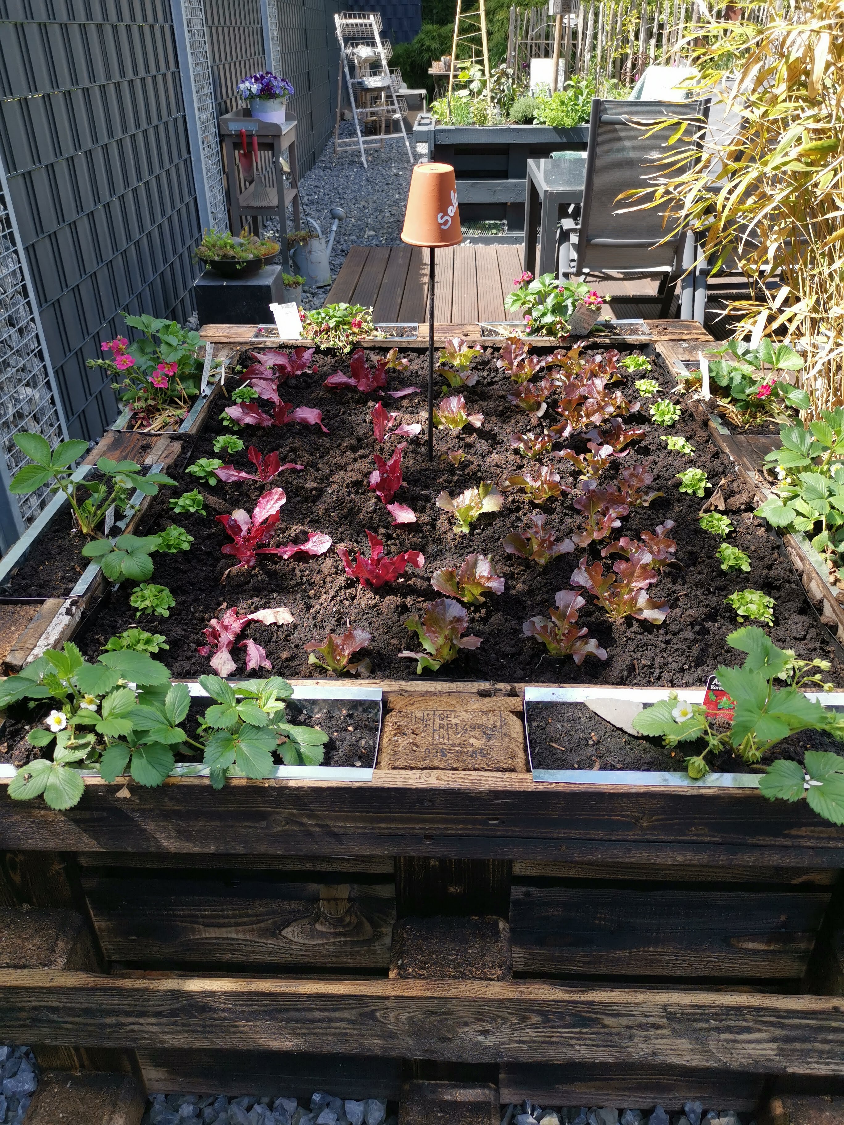 Gerade in meinem Garten kommen mir immer wieder neue Ideen um diesen umzugestalten ( manchmal sehr zum Leidwesen meines Mannes, der mich natürlich immer tatkräftig unterstützen muss). Unser Garten hat keinen Rasen, sondern viele Steine. Um das etwas aufzulockern haben wir dieses Frühjahr zwei Hochbeete aus Paletten gebaut. Die Paletten habe ich günstig im Internet bekommen. Für ein Hochbeet wurden jeweils 4 Paletten benötigt. Die Paletten wurden verschraubt, von innen mit Teichfolie ausgekleidet und dann mit verschiedenen Materialien befüllt ( unten grober Gehölzschnitt, darüber Hächselgut und Laub, halbreifer Kompost und zum Schluss Erde und reifer Kompost). Ein Hochbeet haben wir mit grauer Farbe bemalt, das andere mit einem Abflämmgerät abgeflämmt. Das graue Hochbeet haben wir mit Kräutern bepflanzt ( Basilikum, Schnittlauch, Petersilie, Rosmarin, Minze ,Salbei, Lorbeer, sowie eine Tomatenpflanze). Im abgeflämmten Hochbeet wuchsen Salat, Chili, eine Gurkenpflanze in der Mitte und in den kleinen Behältern am Rand haben wir rundherum Erdbeeren gepflanzt.