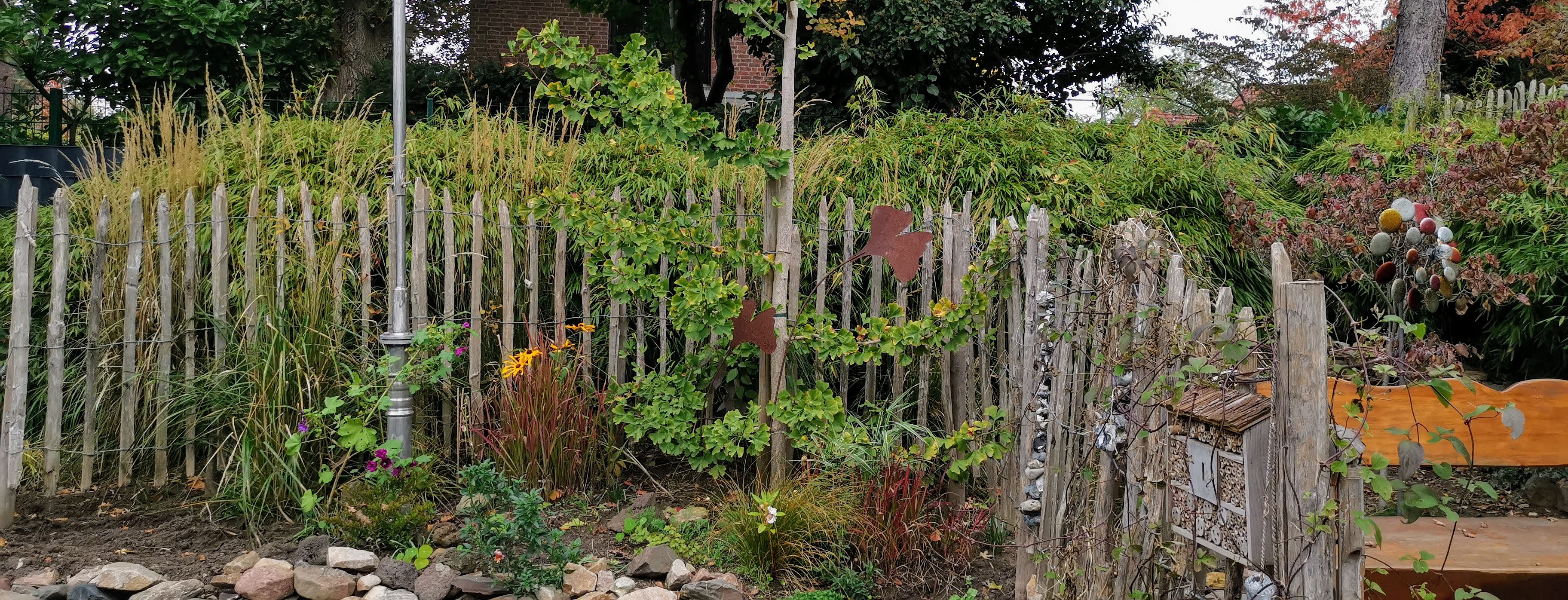 Da ich mit Grauen an die restlichen fünf Bambuspflanzen dachte, habe ich dann den Bambus im Internet inseriert als "an Selbstausbuddeler zu verschenken" und hatte Glück. Ein Dauercamper aus den Niederlanden suchte für seine Dauerparzelle einen Sichtschutz, der schon eine gewisse Höhe haben sollte. Er kam dann mit einem Bekannten und hat zwei Bambuspflanzen ausgebuddelt und mitgenommen und zwei Wochen später nochmal zwei, also mussten wir nur noch einen ausbuddeln. Nachdem das erledigt war haben wir den Staketenzaun, der mitten im Beet verlief ,nach hinten gesetzt, 5 Gräser etwas umgepflanzt und zwei Schmetterlingssträucher eingepflanzt. Der Staketenzaun ist ca 50 cm vom Zaun unseres Gartennachbarn entfernt, diese Lücke hinter dem Staketenzaun möchten wir nutzen um dort Laub und anderen Gartenabfall zu entsorgen, zudem können dort im Winter Igel ihr Winterquartier bauen.