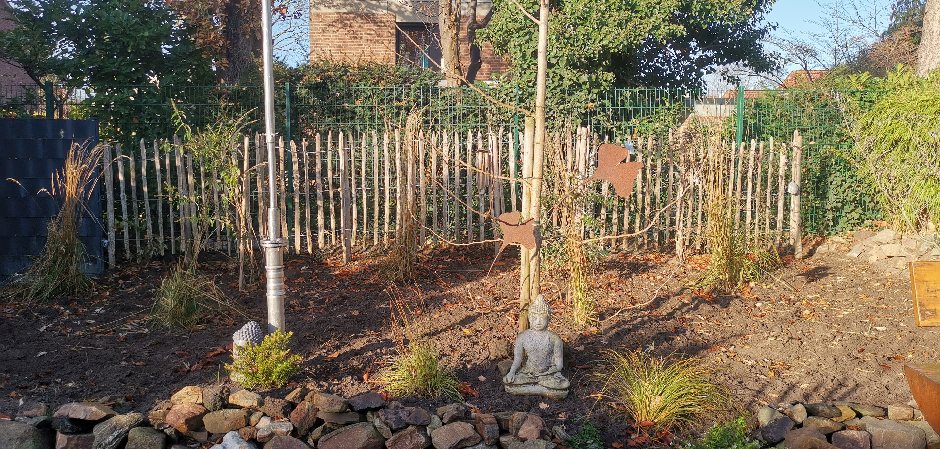 Da ich mit Grauen an die restlichen fünf Bambuspflanzen dachte,  habe ich dann den Bambus im Internet inseriert als "an Selbstausbuddeler zu verschenken" und hatte Glück. Ein Dauercamper aus den Niederlanden suchte für seine Dauerparzelle einen Sichtschutz, der schon eine gewisse Höhe haben sollte. Er kam dann mit einem Bekannten und hat zwei Bambuspflanzen ausgebuddelt und mitgenommen und zwei Wochen später nochmal zwei, also mussten wir nur noch einen ausbuddeln. Nachdem das erledigt war haben wir den Staketenzaun, der mitten im Beet verlief ,nach hinten gesetzt, 5 Gräser etwas umgepflanzt und zwei Schmetterlingssträucher eingepflanzt. Der Staketenzaun ist ca 50 cm vom Zaun unseres Gartennachbarn entfernt, diese Lücke hinter dem Staketenzaun möchten wir nutzen um dort Laub und anderen Gartenabfall zu entsorgen, zudem können dort im Winter Igel ihr Winterquartier bauen.
